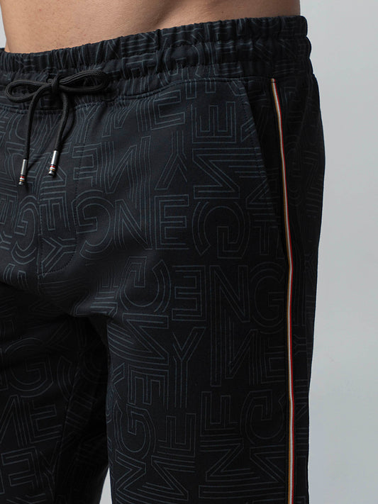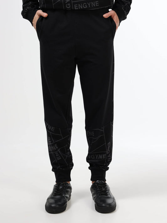 Regular Fit Cut and Sew Joggers in Cotton Poly Lycra Rougen Loop Knit with All Over ENGYNE Rotary Discharge Print - Black