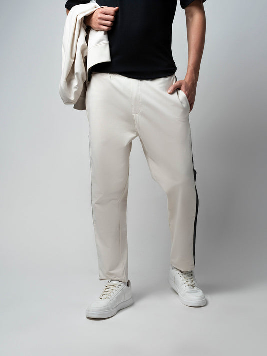 Rougen Cotton Elastane Loop Knit Trackpant with Contrast Woven Side Tape Beige