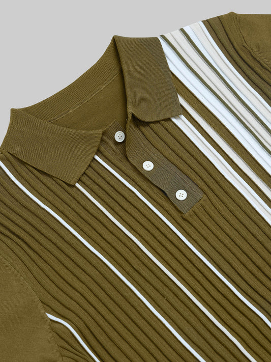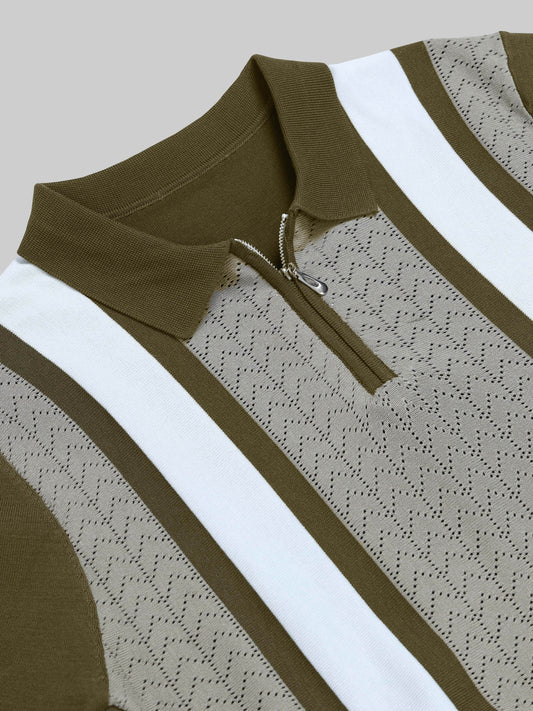 Chevron Stripe Flat-Knit Zip Polo - Olive
