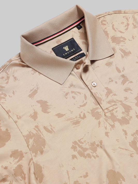 Regular Fit Supima Cotton LuxeKnit Polo with All Over Floral Rotary Pigment Print and Slim Flat Knit Collar and Cuff -Tan