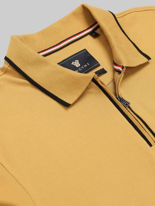 Regular Fit Polo in Supima Cotton Lycra Piqué with DTM Tipped Flat Knit Collar and Cuff, Zipper Placket, and HD Chest Branding Sticker - Mustard Gold