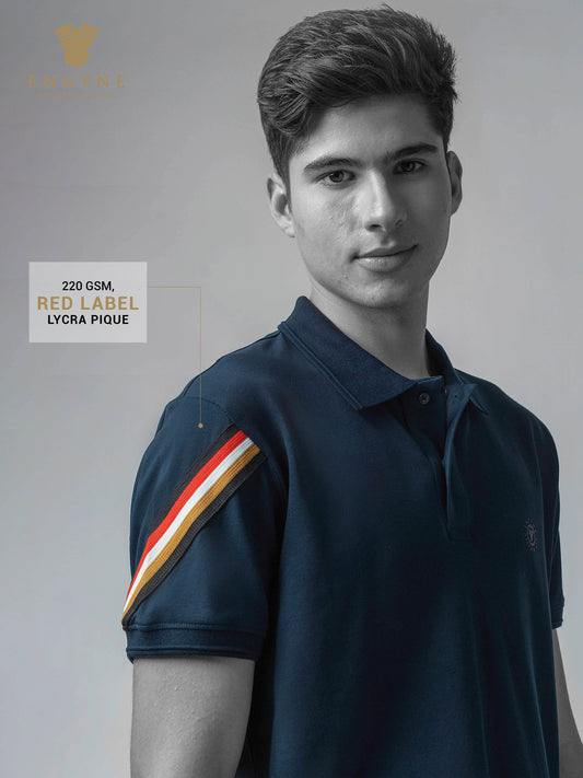 Rougen Cotton Lycra with Engyne Signature Flag Tape Sleeve and Speed-Breaker Textured Collar Navy Polo