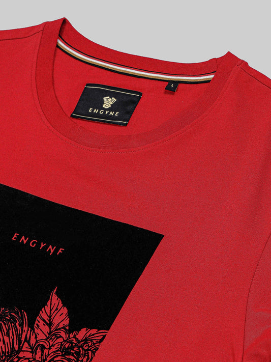 Rougen Cotton Lycra with Flock Print at Chest Red T-shirt