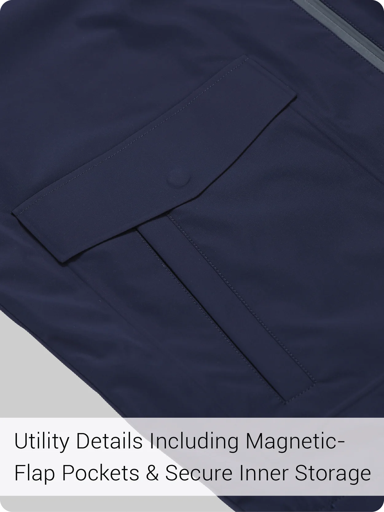 Thoughtful details elevate function: welt pockets with mock magnetic flaps, an interior passport pocket, and a secure inner zipper pocket ensure essentials are always within reach—whether you’re commuting, traveling, or on the go. Elasticated cuffs and hem provide a structured yet flexible fit that moves with you.