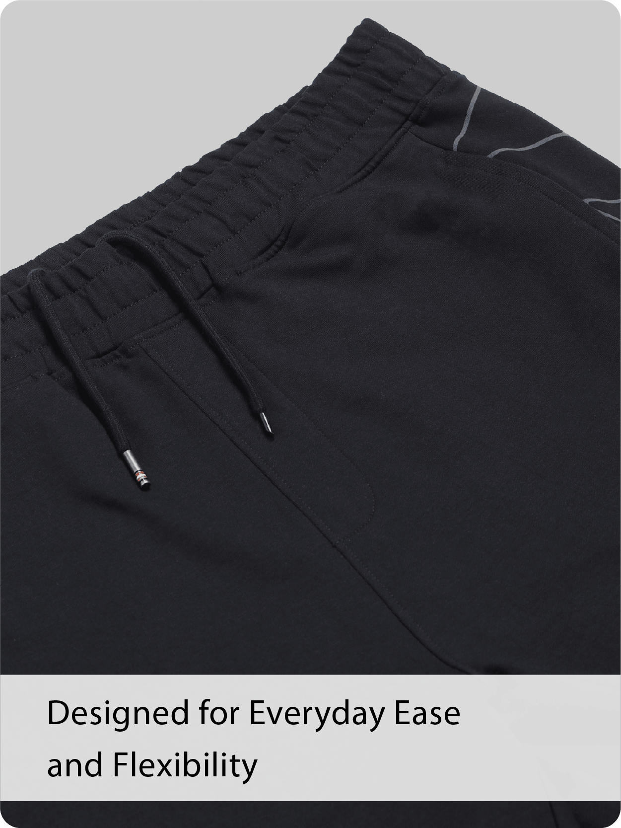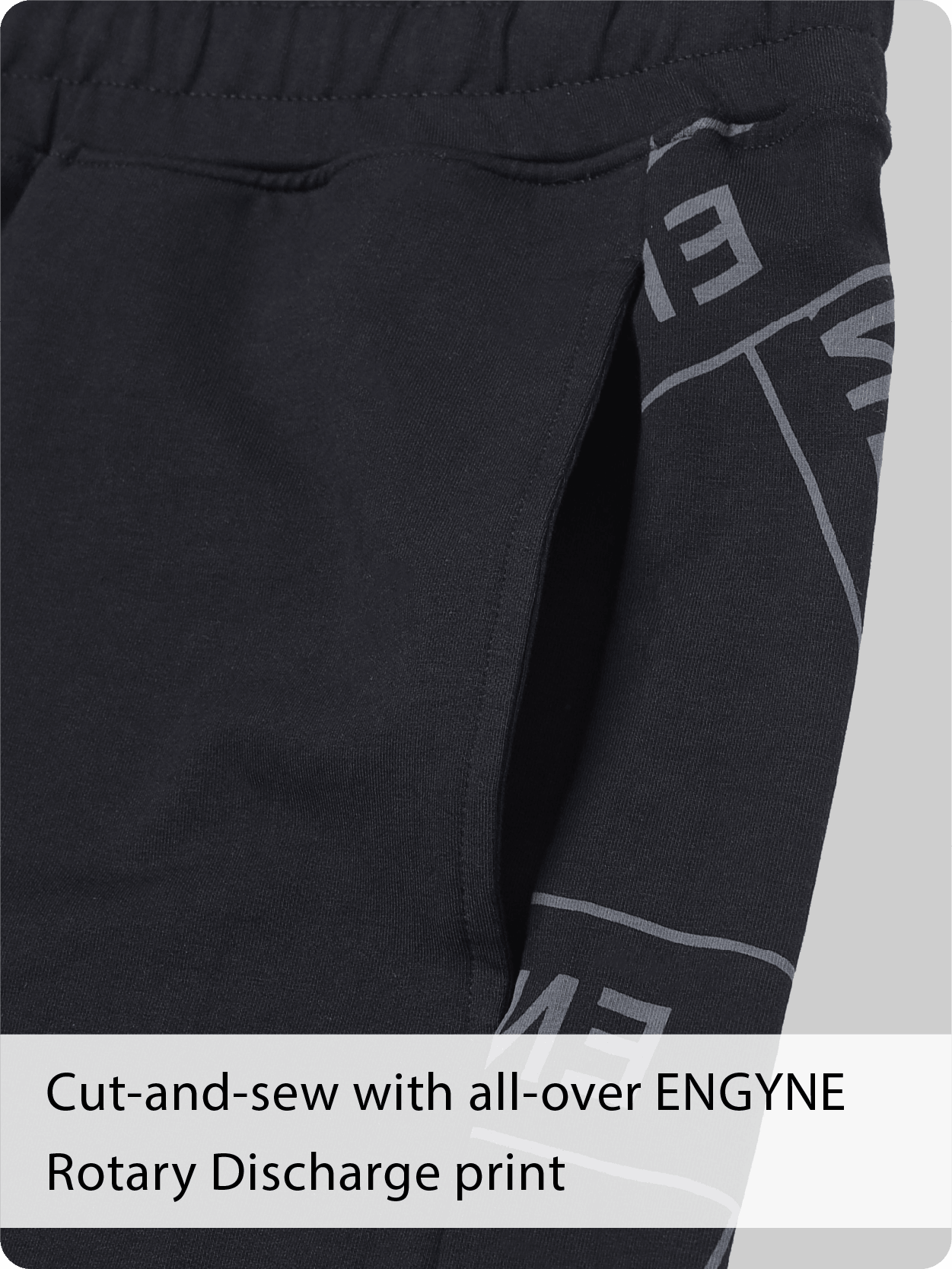 Regular Fit Cut and Sew Joggers in Cotton Poly Lycra Rougen Loop Knit with All Over ENGYNE Rotary Discharge Print - Black