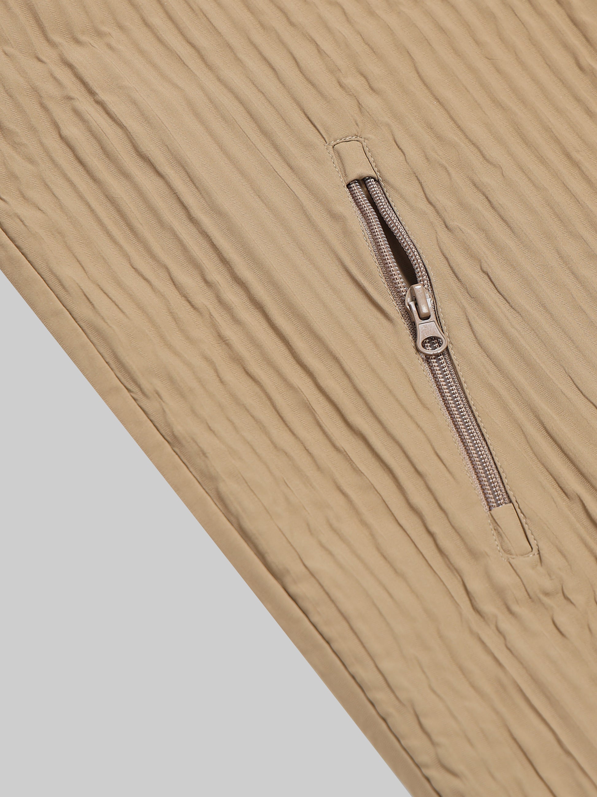 Two diagonal zipper pockets integrate functionality into its sharp design, while elasticated cuffs add structure, shape, and comfort. Finished with a water-resistant surface, this piece is designed to handle unpredictable weather across the seasons — a statement jacket that transitions seamlessly between occasions and styles.